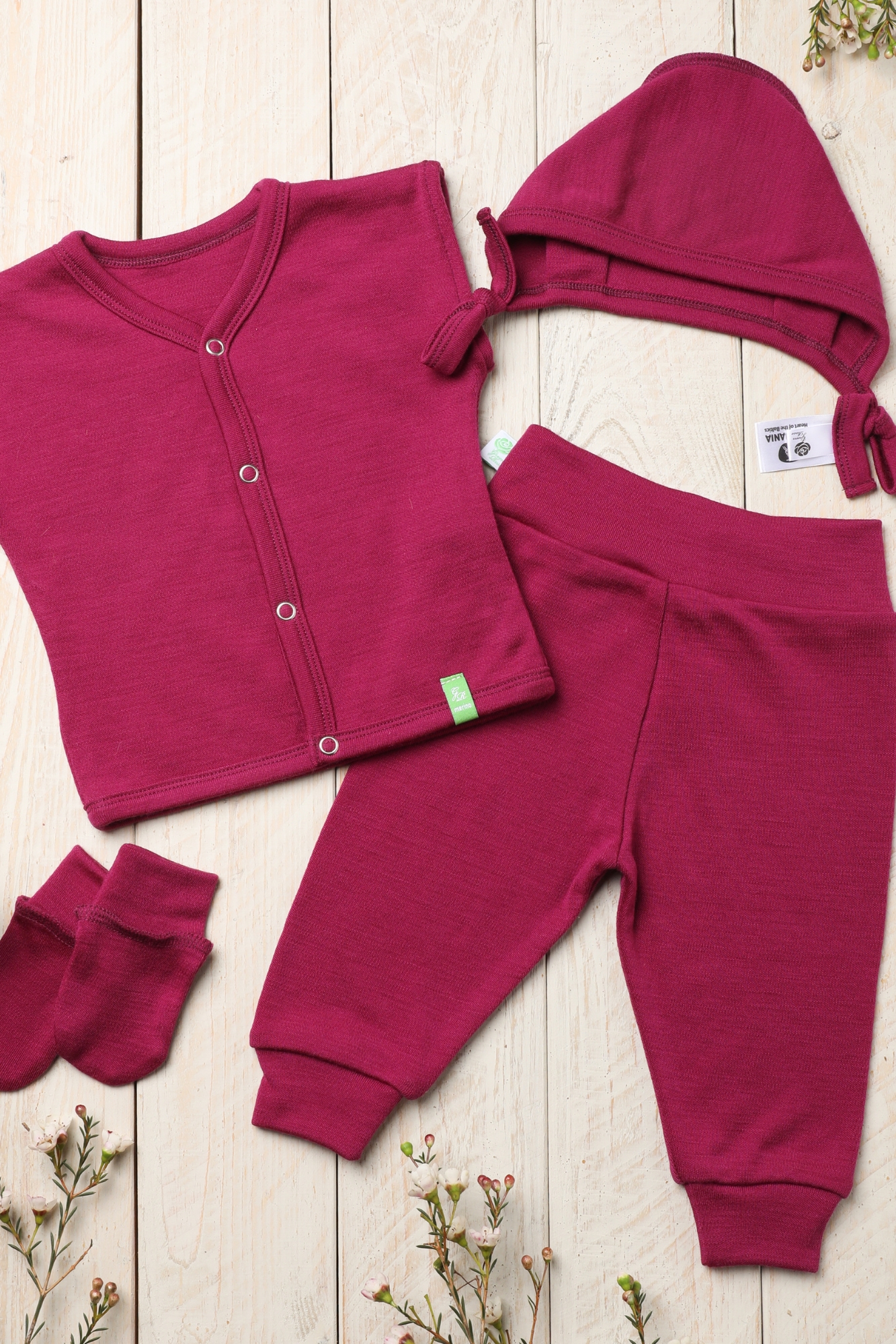 100% merino vilna vertinama dėl natūralaus švelnumo, malonaus pojūčio prie odos ir gebėjimo padėti palaikyti mažyliui komfortišką šilumą. Tai ypač svarbu naujagimiui, kurio oda yra labai jautri, o pirmasis sluoksnis turi būti ne tik dailus, bet ir iš tiesų malonus kūnui. Pasirinktinai šį rinkinį galima rinktis ir iš merino vilnos su šilku – dar švelnesnio, lengvesnio audinio varianto.