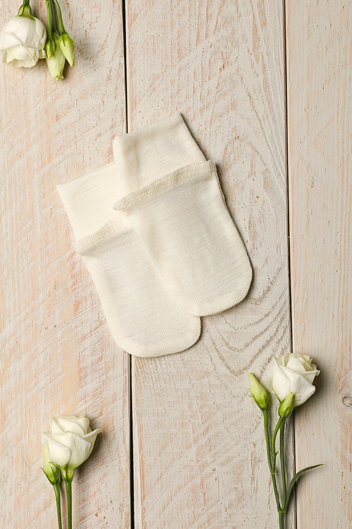 Šios pirštinytės pasiūtos iš merino vilnos su šilku audinio. Toks derinys vertinamas dėl išskirtinio švelnumo, malonaus prisilietimo ir jaukaus pojūčio. Pirštinytės lengvai apgaubia rankytes, neerzina odos ir tinka tada, kai norisi natūralesnio drabužėlio jautriai naujagimio kasdienybei. Jos gali būti naudingos tiek namuose, tiek lauke, kai svarbu apsaugoti mažylį nuo vėsesnio oro.