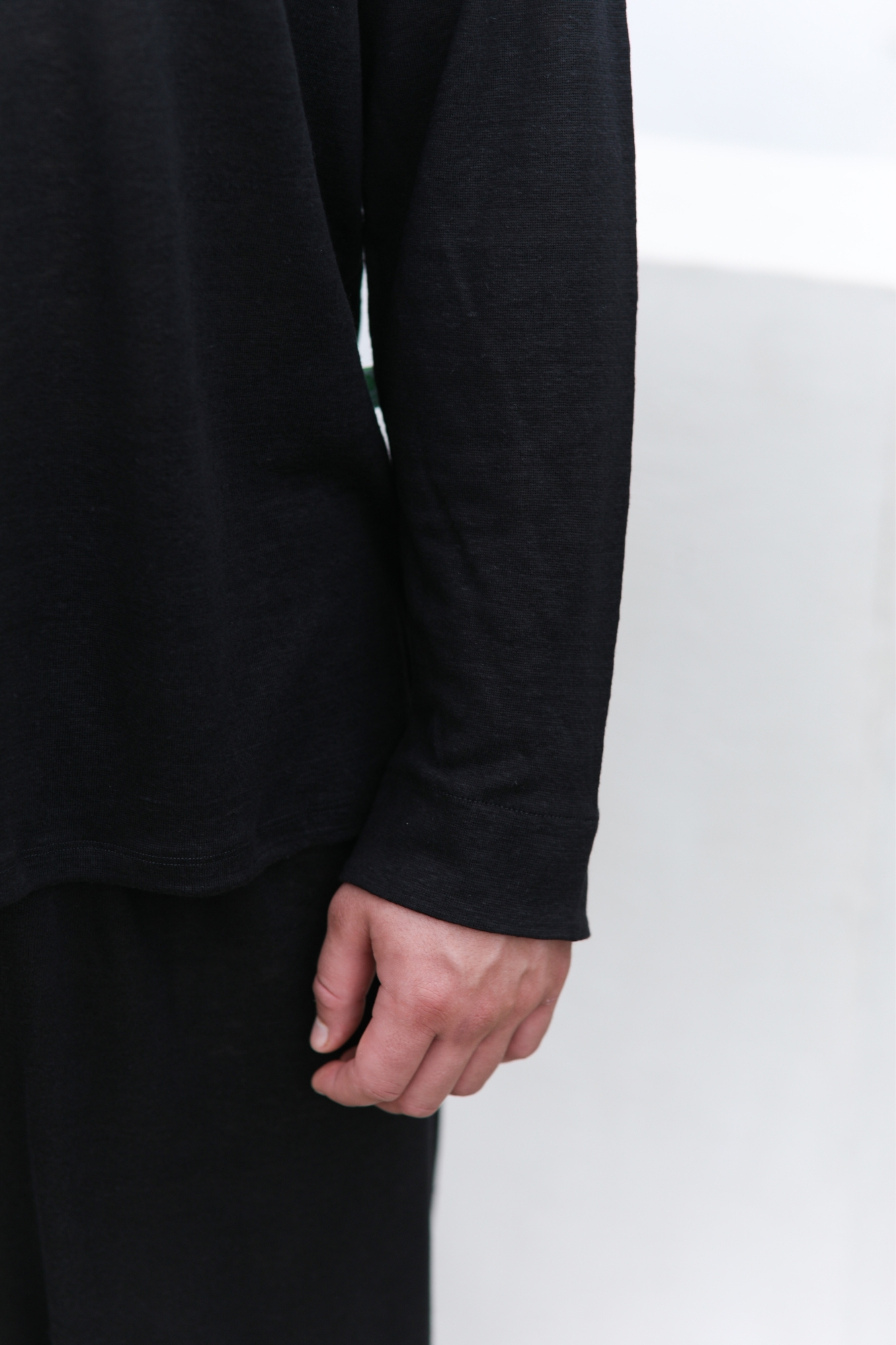 Viršų galite dėvėti ne tik kaip pižamos dalį. Jis tinka ir kaip namų palaidinė prie kitų kelnių ar šortų. Jei norisi sluoksnio vėsesniam vakarui, patogiai derės ir merino vilnos džemperis, kurį galima užsimesti ant viršaus.