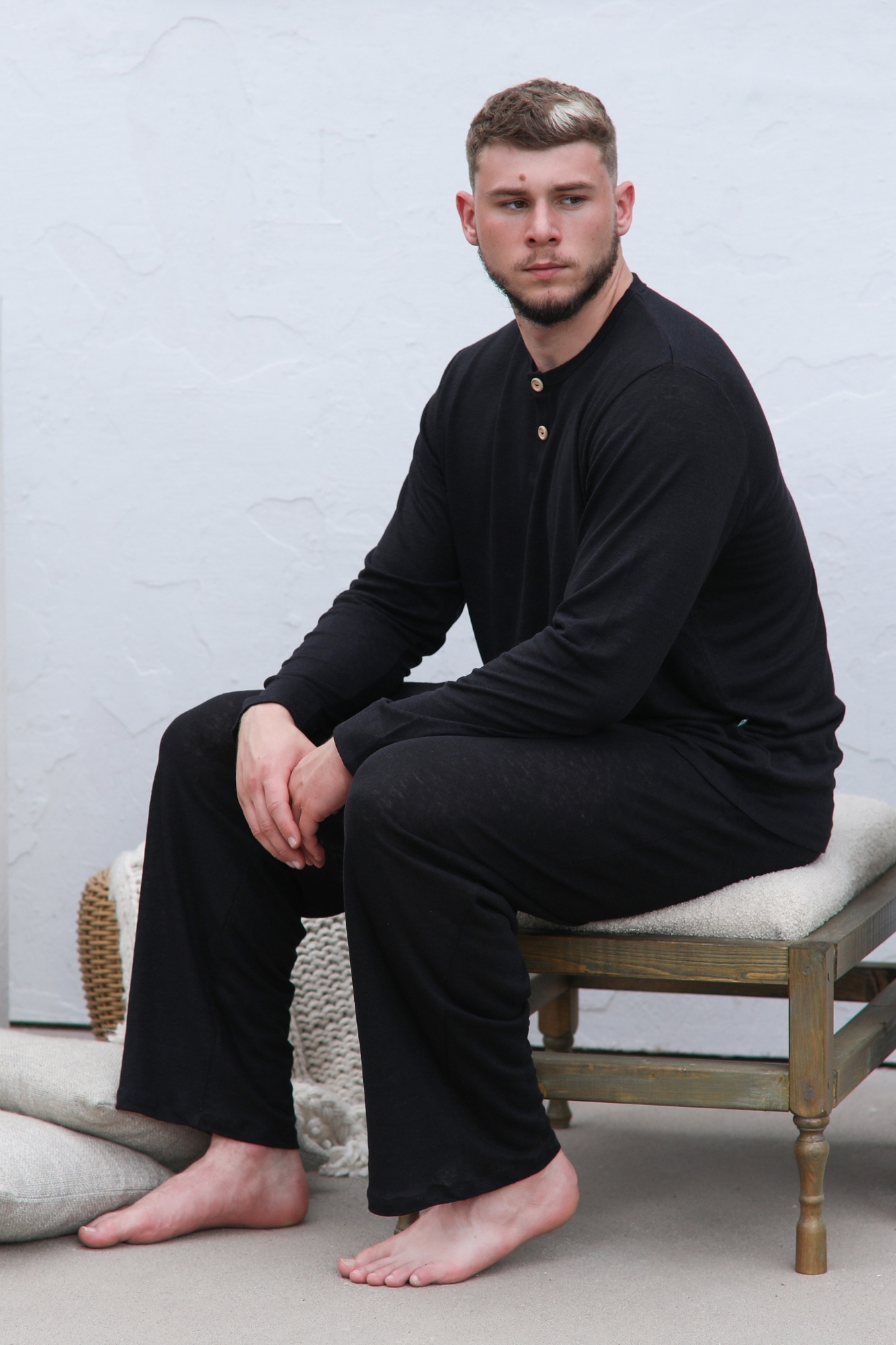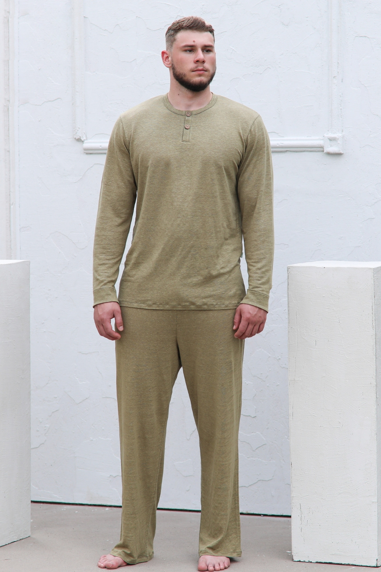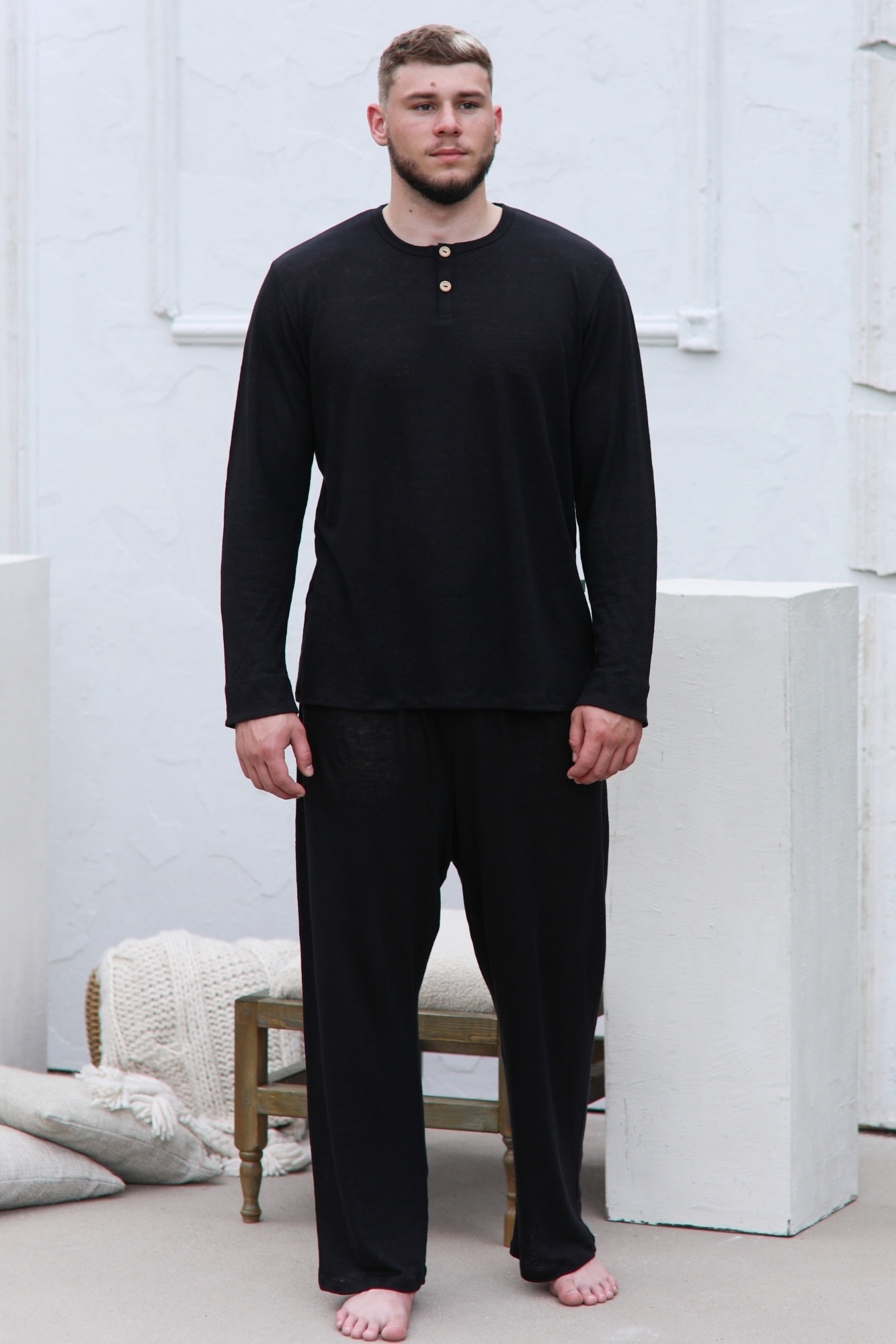 Vyriška lininė pižama ilgomis rankovėmis – minkštas lino trikotažo komplektas miegui ir poilsiui. Lininė vyriška pižama gražiai atrodo ir kaip apranga namams.