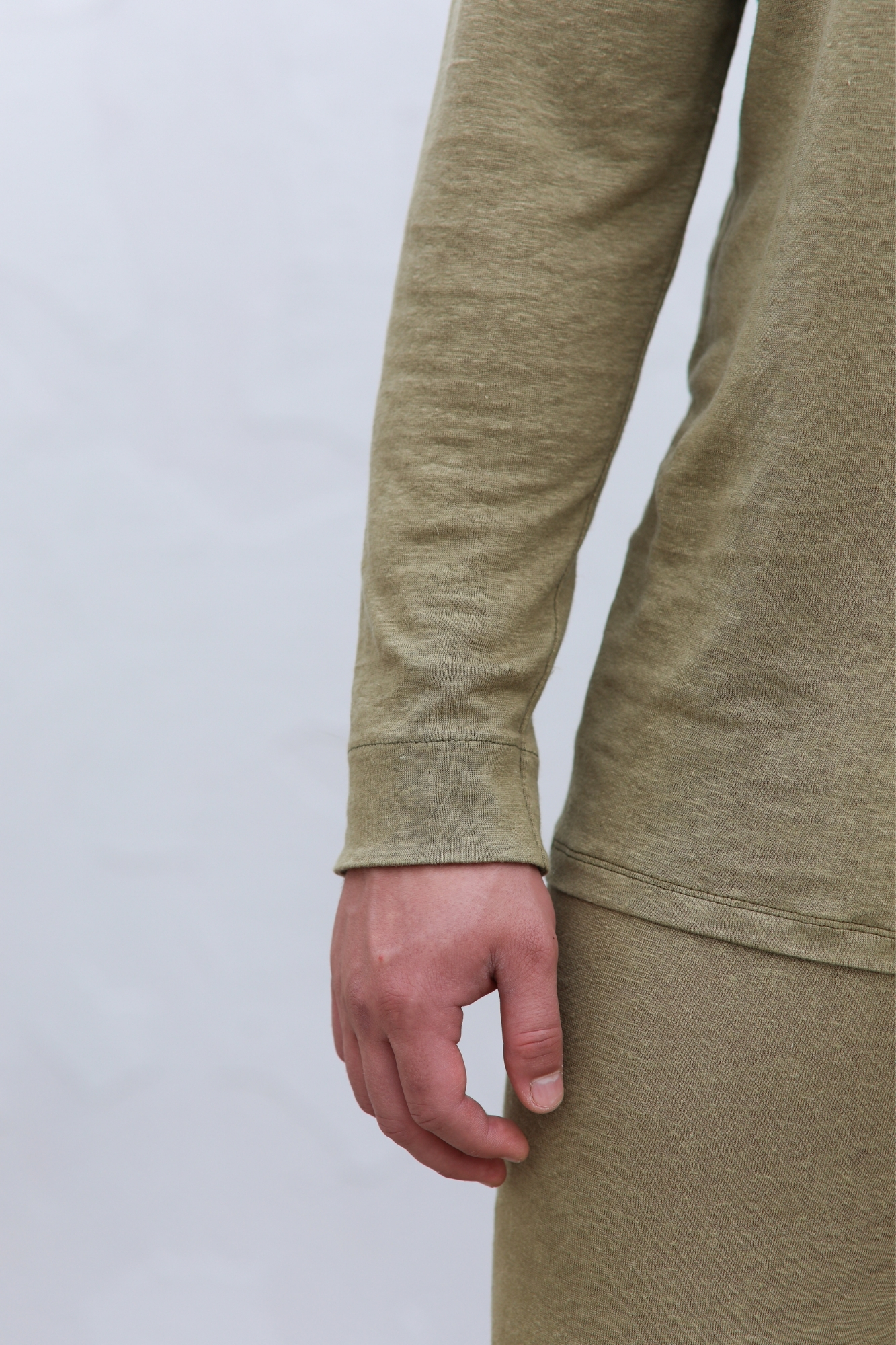 Tai lininė dviejų dalių pižama, kurią sudaro viršutinė dalis ilgomis rankovėmis ir tiesaus kritimo kelnės. Viršus turi subtilų užsegimą su sagutėmis ties iškirpte, todėl prigludimas atrodo tvarkingai, o kaklo zona lieka patogi. Toks sprendimas pasiteisina ir miegant, ir poilsiaujant namuose, kai norisi, kad drabužis atrodytų „tvarkingas“, bet jaustųsi laisvai.